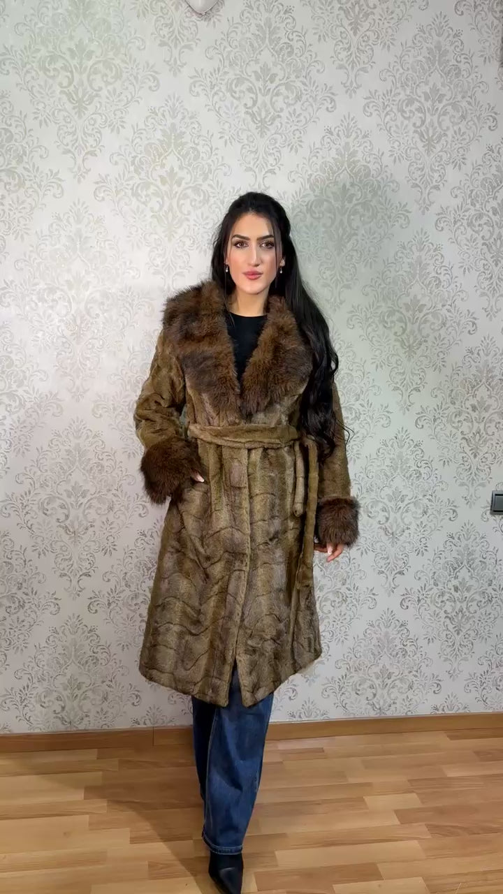 Elegante abrigo largo para mujer confeccionado con un sofisticado acabado efecto pelo, ideal para aportar calidez y estilo durante la temporada de frío. Su diseño destaca por un cuello amplio y puños con efecto pelo, que añaden un toque lujoso y moderno.